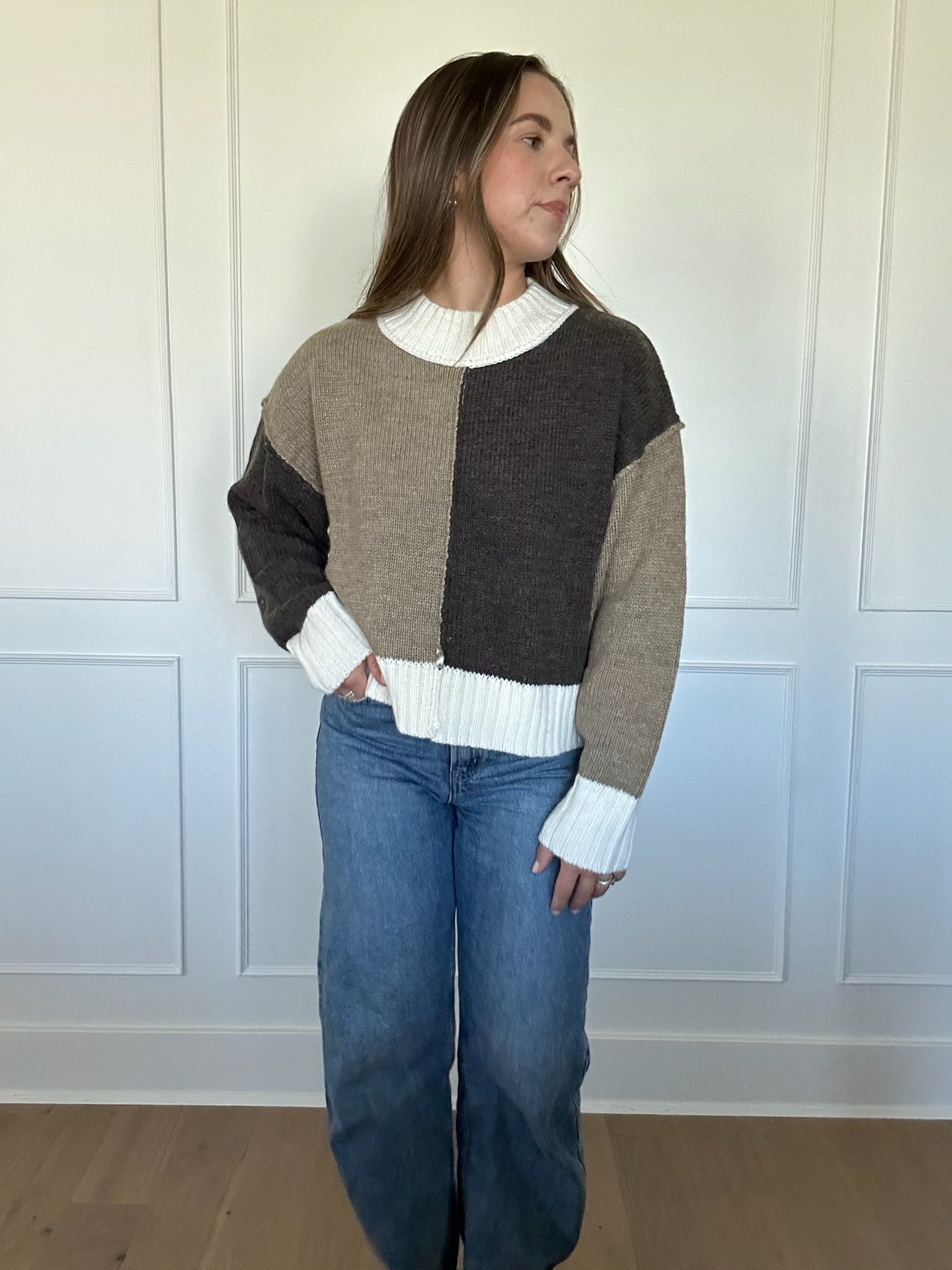 - We love how unique the look of this sweater is with the color block color way. This sweater can be worn with any color of denim bottoms and is so cozy!