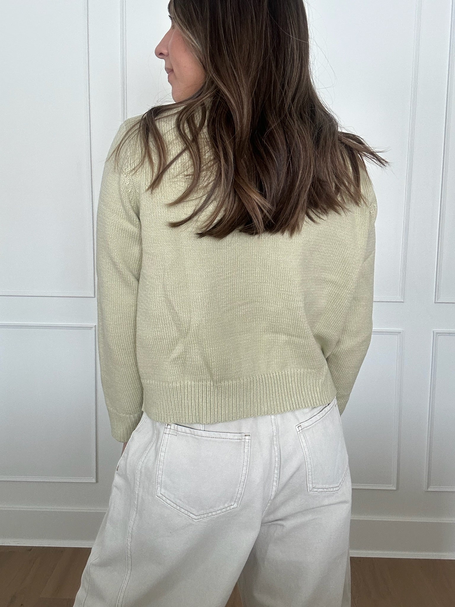 - Pistachio knit cardigan with functional silver zipper and pocket details