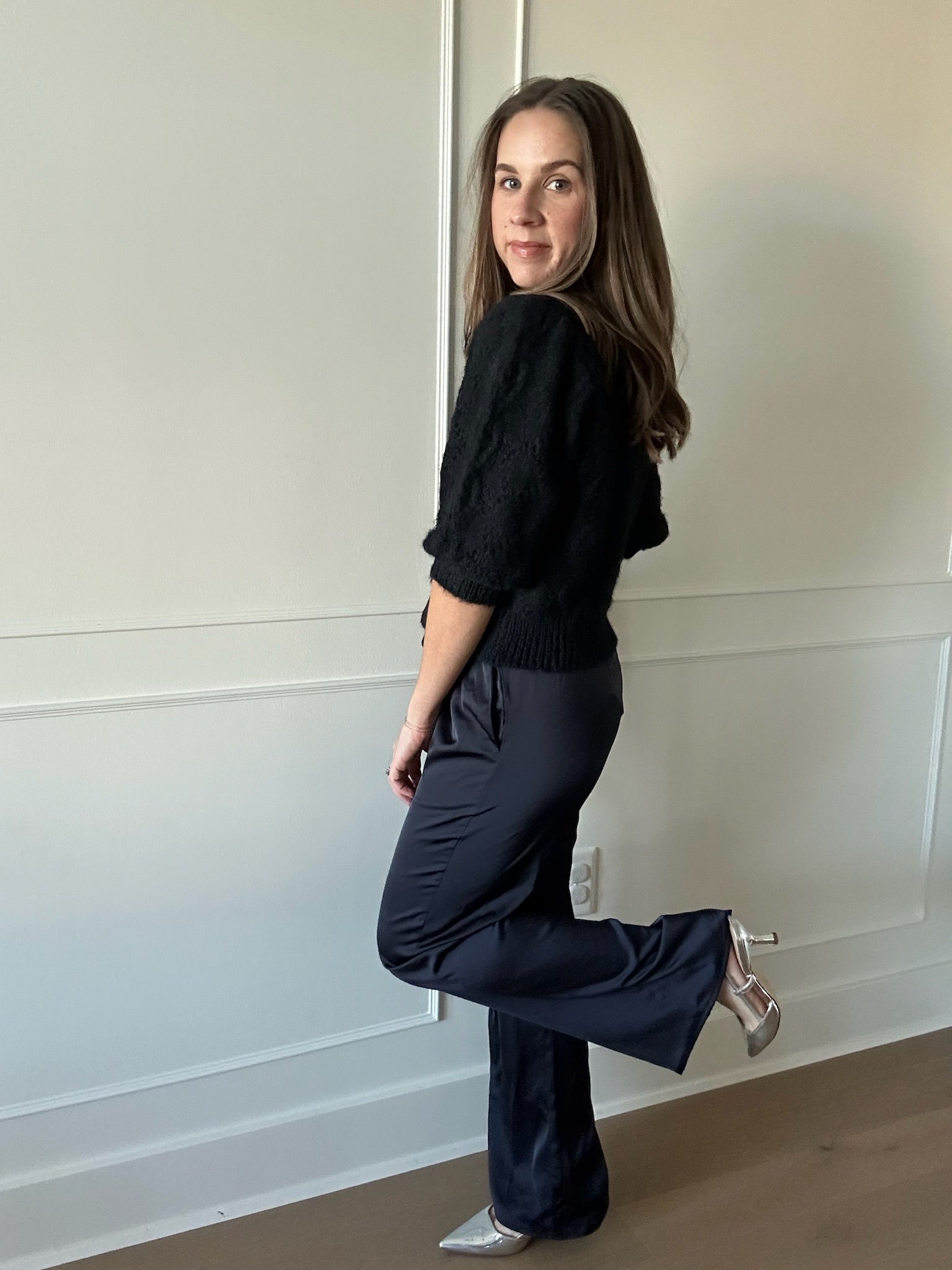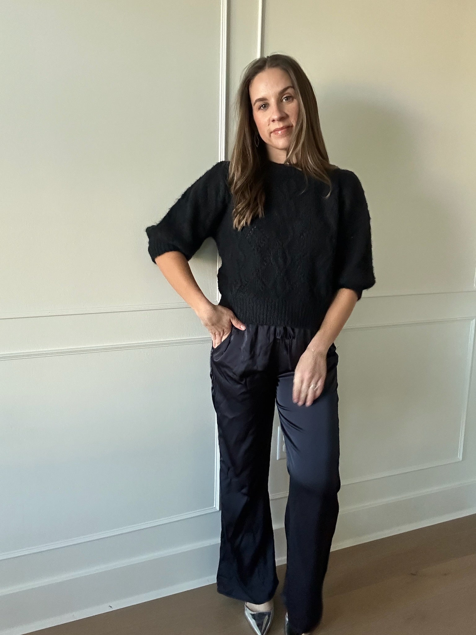 - Navy sweater with quarter length sleeves and a cable knit texture