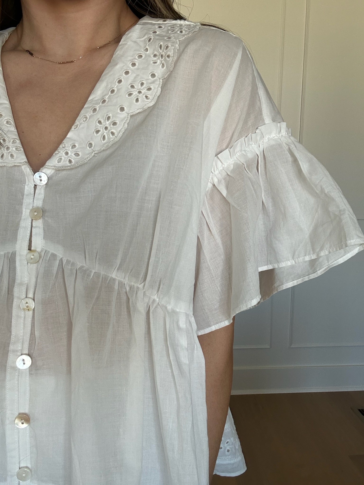 - White baby doll style top with eyelet collar and hemline details and flowy flutter style sleeves
